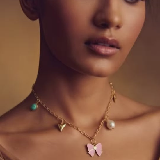 This necklace blends playful charm with refined elegance. Featuring a pink enamel butterfly, a lustrous pearl, and delicate heart and bow accents, it adds a soft statement while remaining light and effortless for everyday wear.